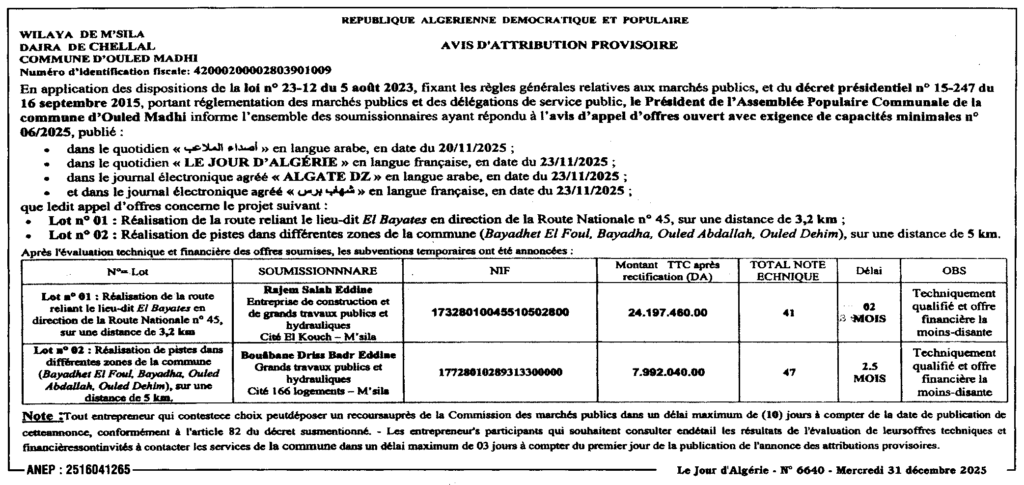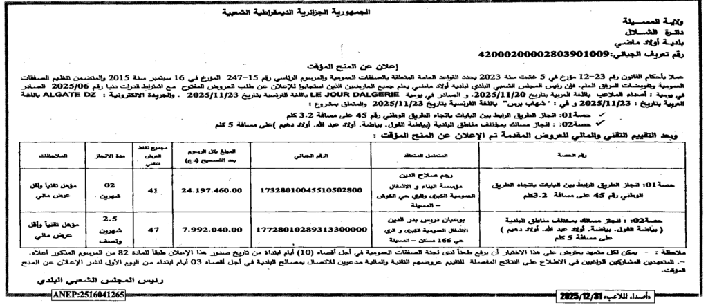 إعلان عن المنح المؤقت انجاز الطريق والمسالك بمختلف مناطق البلدية/ بلدية أولاد ماضي