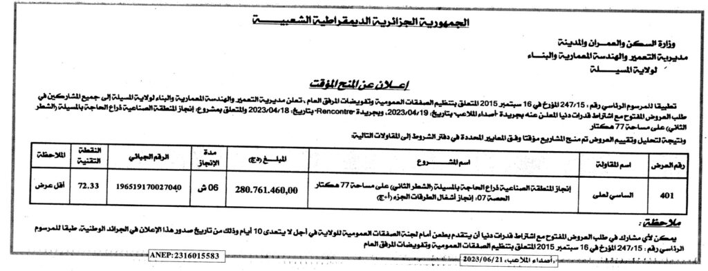 إعلان عن المنح المؤقت: انجاز المنطقة الصناعية ذراع الحاجة/ مديرية التعمير والهندسة المعمارية والبناء لولاية المسيلة