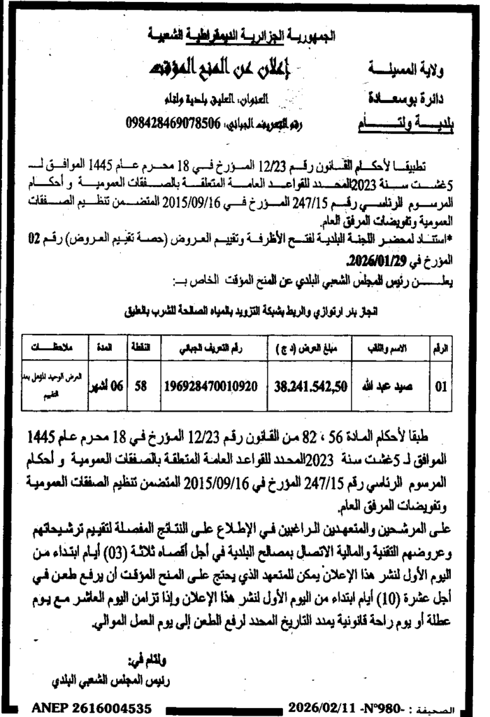 إعلان عن المنح المؤقت انجاز بئر ارتوازيوالربط بشبكة التزويد بالمياه الصالحة للشرب بالعليق/ بلدية ولتام