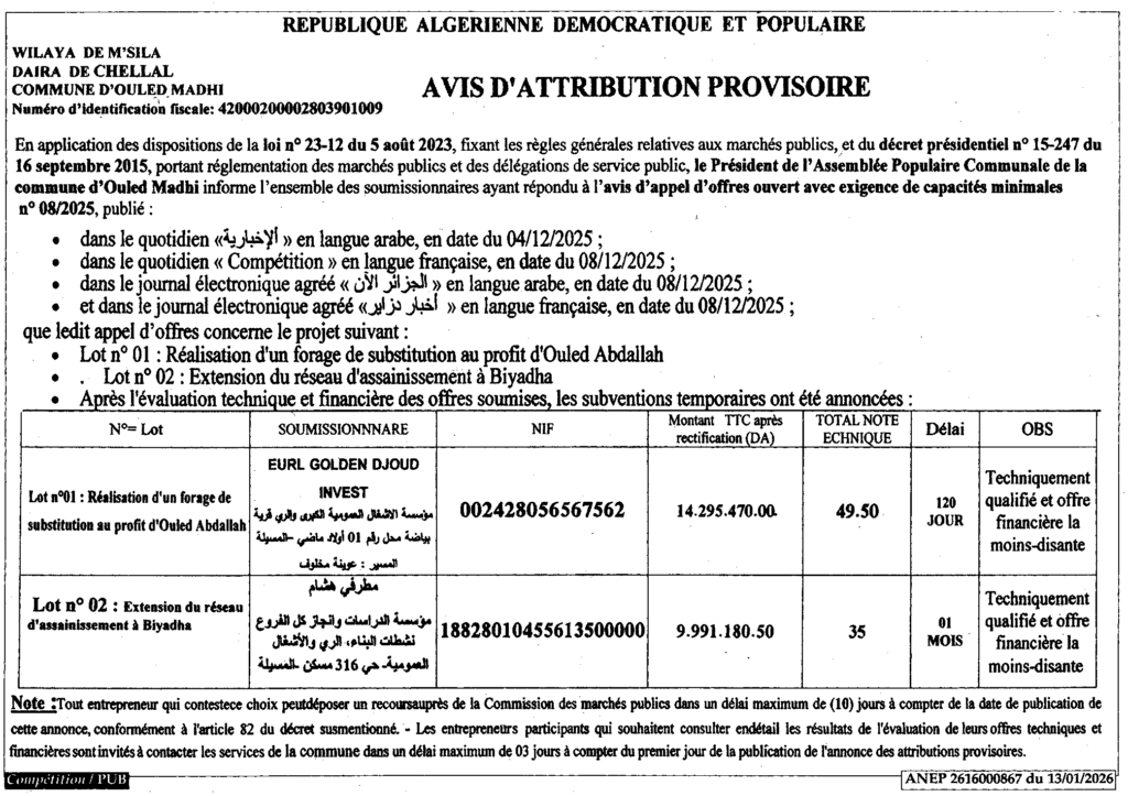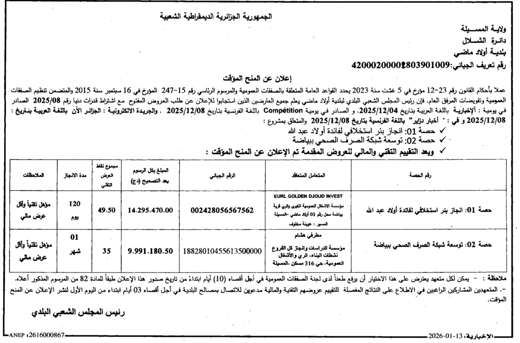 إعلان عن المنح المؤقت انجاز بئر استخلافي وتوسعة شبكة الصرف الصحي/ بلدية أولاد ماضي