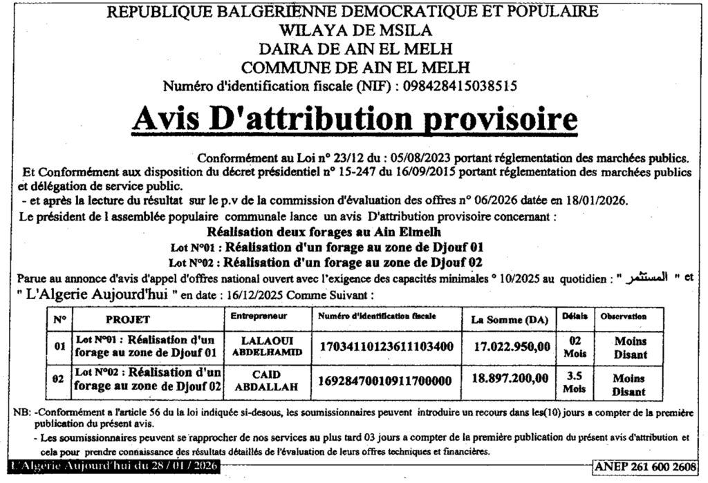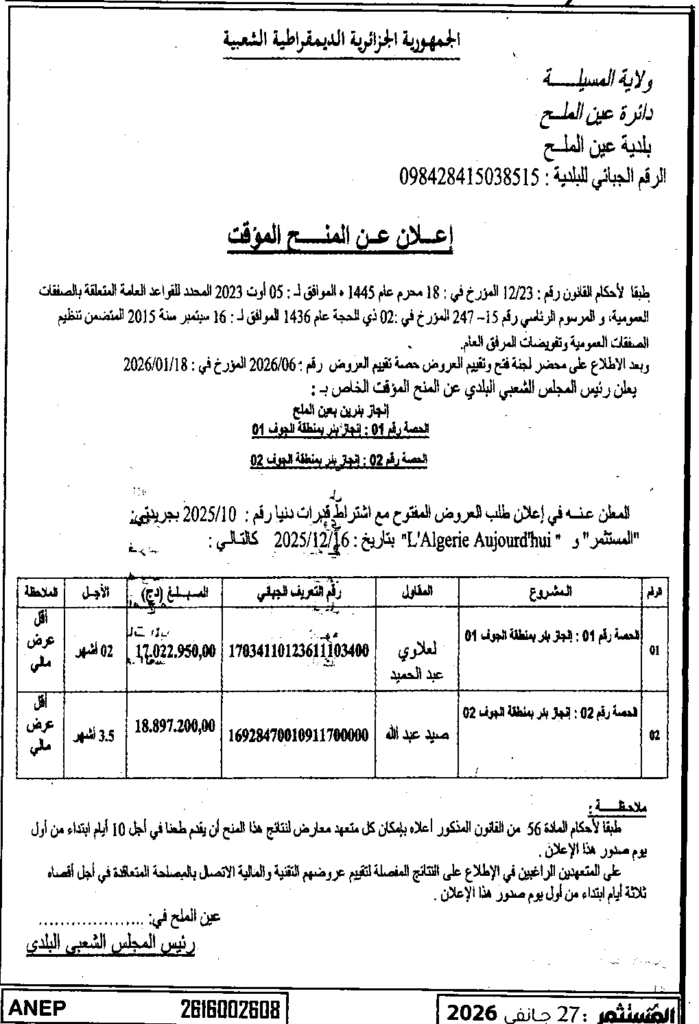 إعلان عن المنح المؤقت انجاز بئر بعين الملح/ بلدية عين الملح
