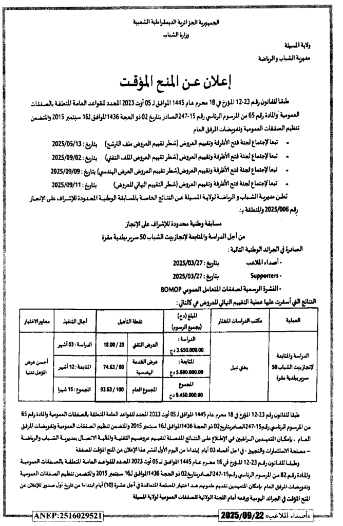 إعلان عن المنح المؤقت انجاز بيت الشباب 50 سرير ببلدية مقرة/ مديرية الشباب والرياضة بولاية المسيلة