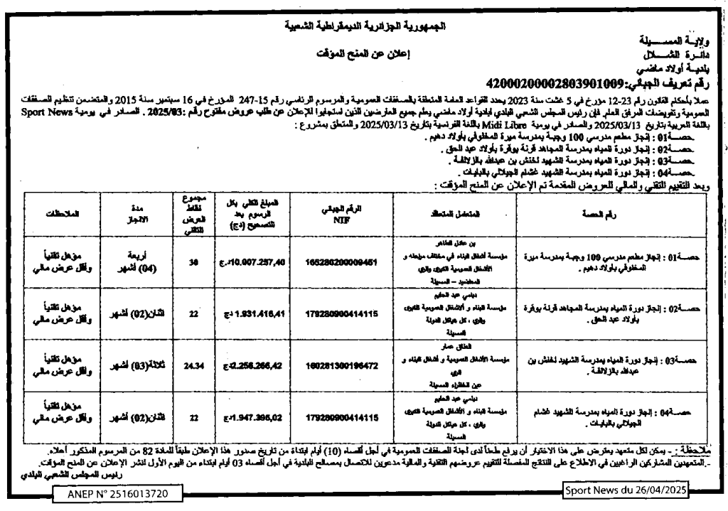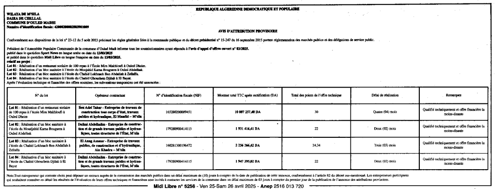 إعلان عن المنح المؤقت انجاز تجهيزات بمدارس بلدية أولاد ماضي