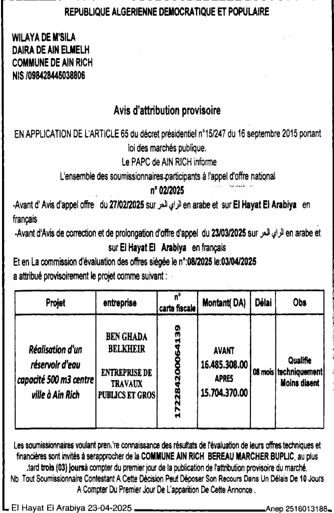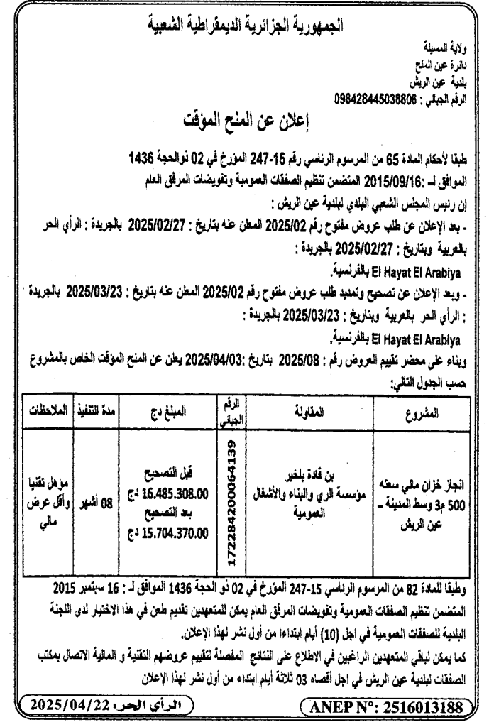 إعلان عن المنح المؤقت انجاز خزان مائي سعته 500 م3 وسط المدينة/ بلدية عين الريش