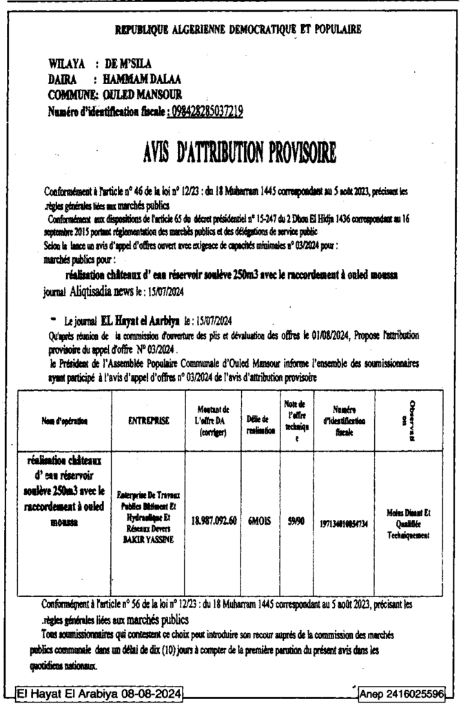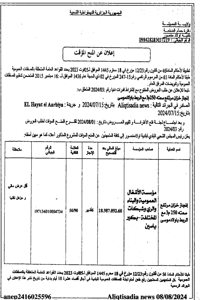إعلان عن المنح المؤقت انجاز خزان مرتفع سعته 250 م3 مع الربط بأولاد موسى/ بلدية أولاد منصور