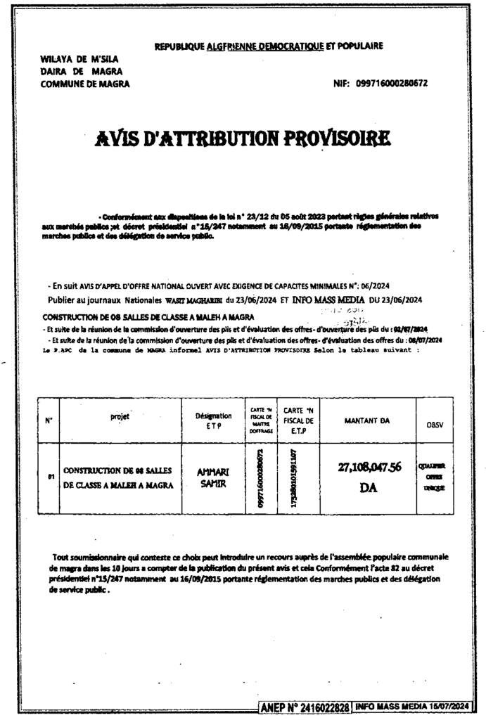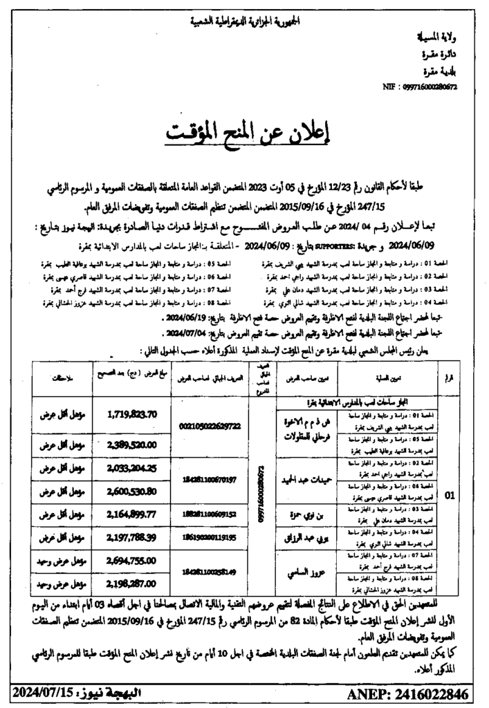 إعلان عن المنح المؤقت انجاز ساحات لعب بالمدارس الابتدائية بمقرة