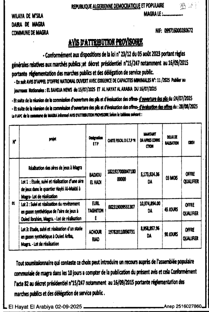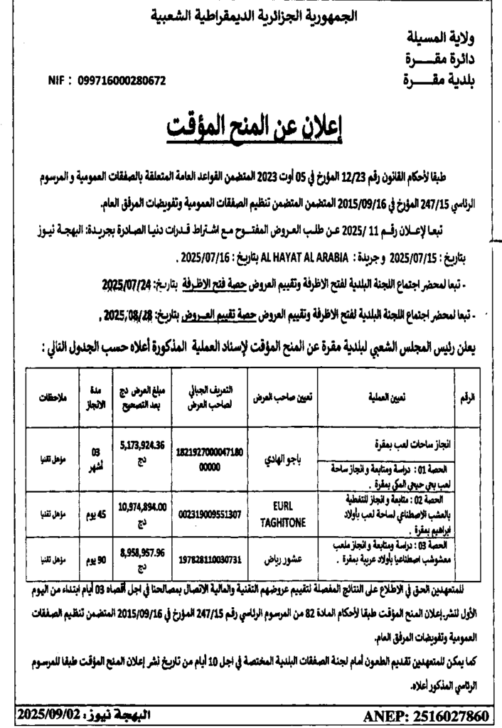 إعلان عن المنح المؤقت انجاز ساحات لعب/ بلدية مقرة