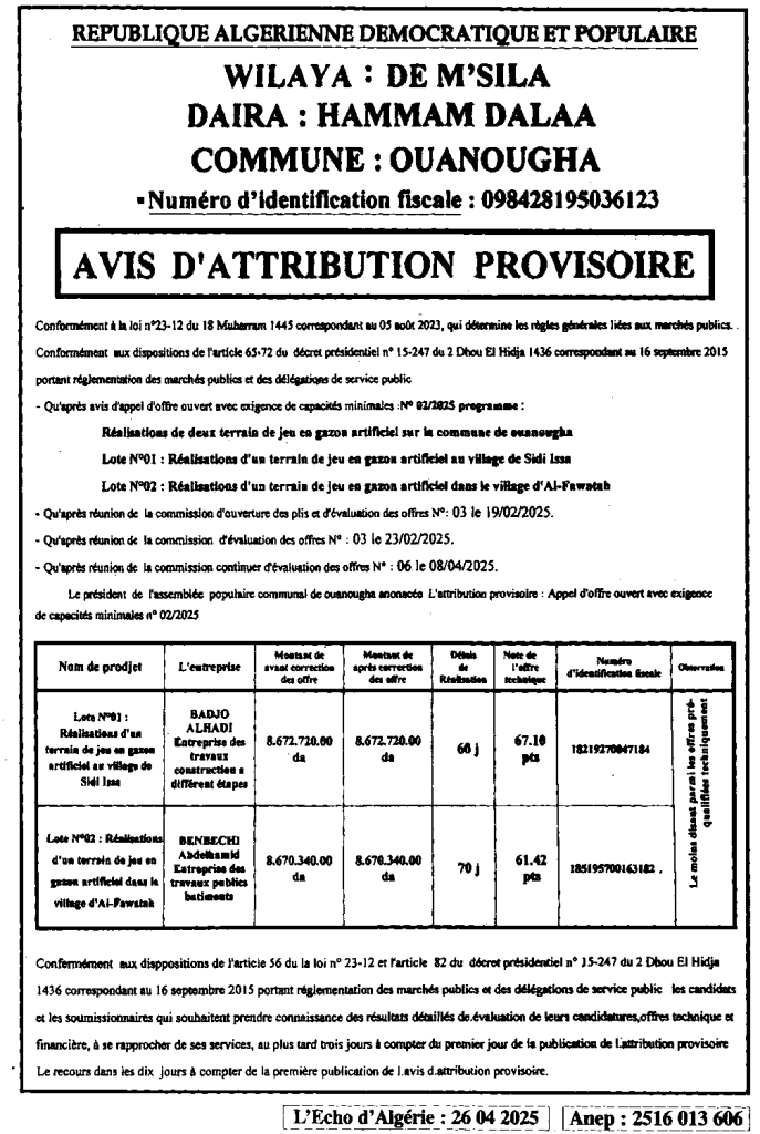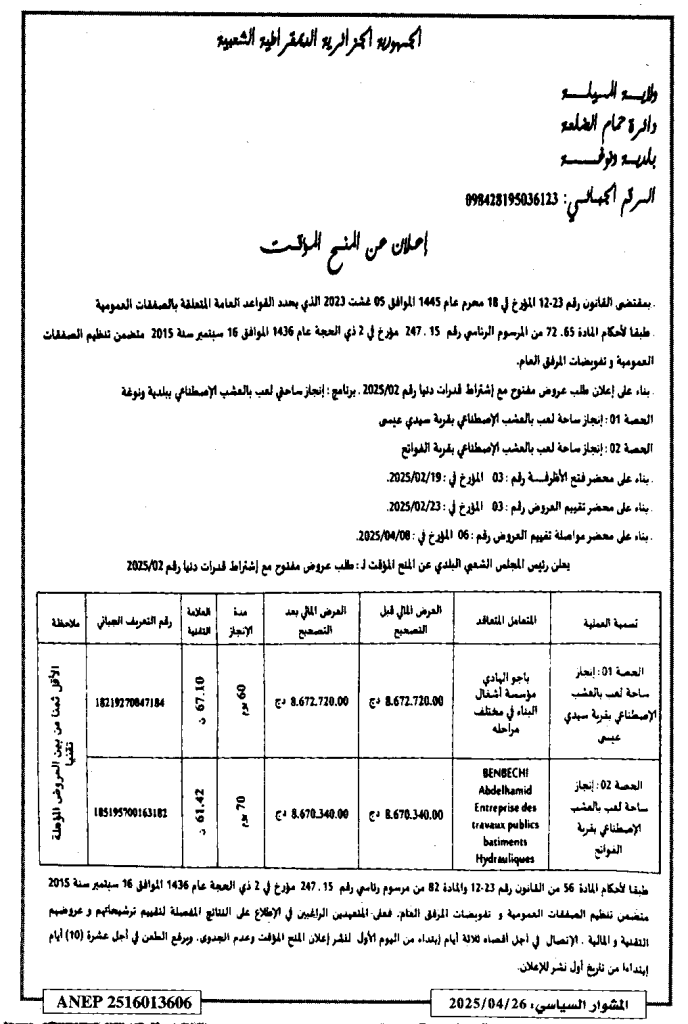 إعلان عن المنح المؤقت انجاز ساحتي لعب بالعشب الاصطناعي/ بلدية ونوغة