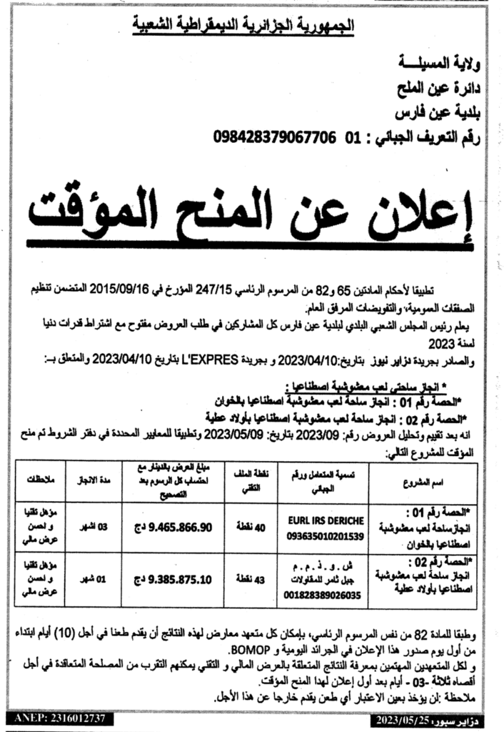 إعلان عن المنح المؤقت: انجاز ساحتي لعب معشوشبة اصطناعيا بلدية عين فارس