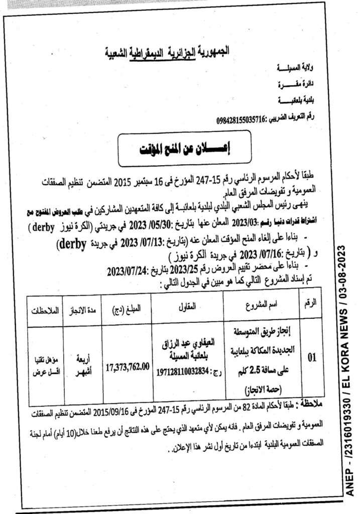 إعلان عن المنح المؤقت: انجاز طريق المتوسطة الجديدة المكاكة ببلعايبة على مسافة 2,5 كلم