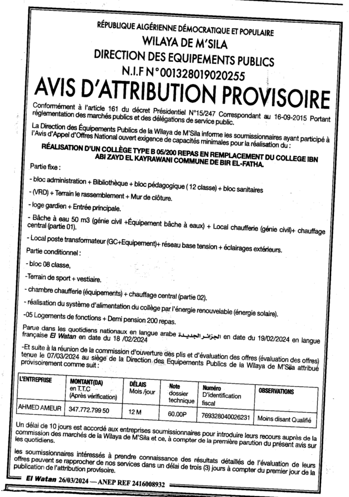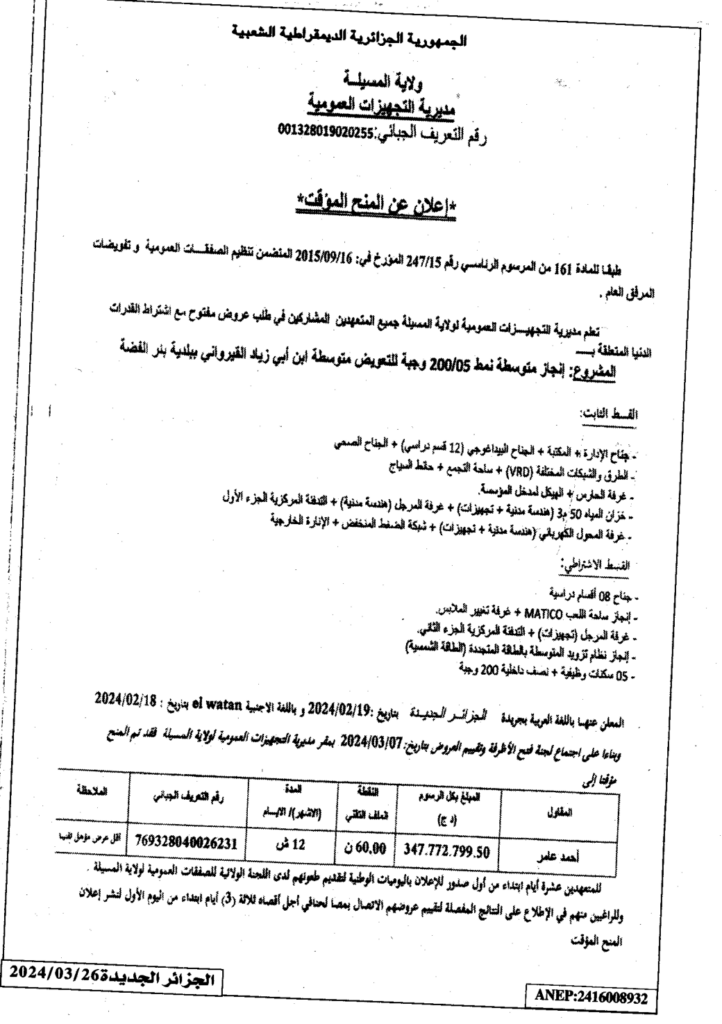إعلان عن المنح المؤقت: انجاز متوسطة نمط 200/05 وجبة للتعويض متوسطة ابن أبي زياد القيرواني ببلدية بئر الفضة/ مديرية التجهيزات العمومية لولاية المسيلة
