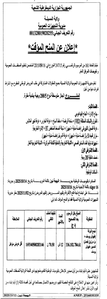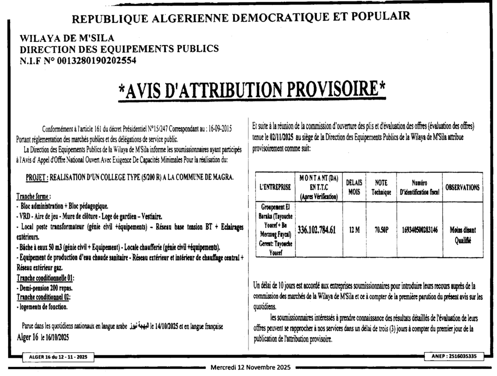 إعلان عن المنح المؤقت انجاز متوسطة نوع 200/5 وجبة ببلدية مقرة/ مديرية التجهيزات العمومية لولاية المسيلة