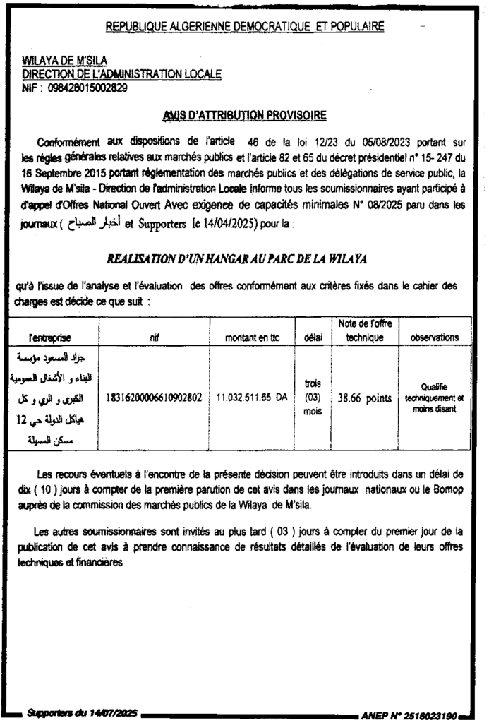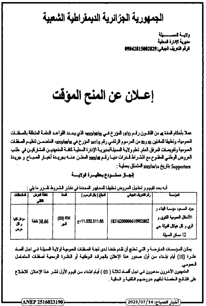 إعلان عن المنح المؤقت انجاز مستودع بحظيرة الولاية/ مديرية الإدارة المحلية لولاية المسيلة