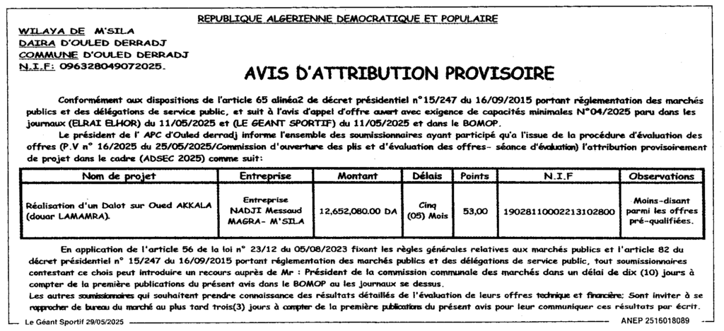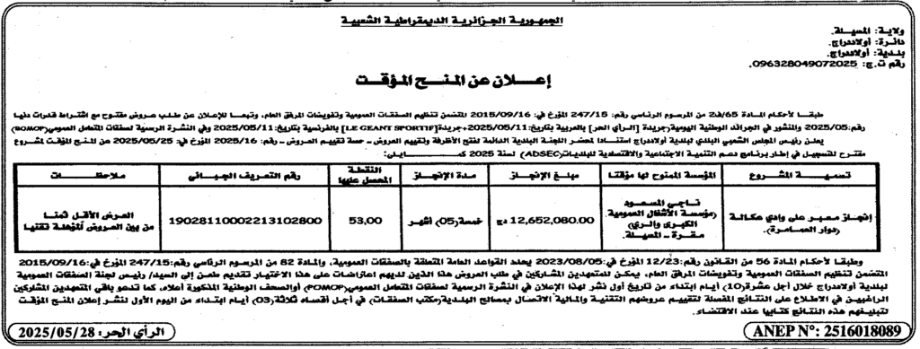 إعلان عن المنح المؤقت انجاز معبر على وادي عكالة (دوار العمامرة)/ بلدية أولاد دراج