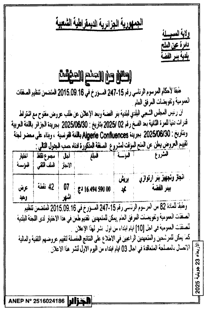 إعلان عن المنح المؤقت انجاز وتجهيز بئر ارتوازي/ بلدية بئر الفضة