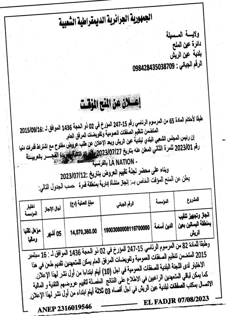 إعلان عن المنح المؤقت: انجاز وتجهيز تنقيب بمنطقة البساتين بعين الريش