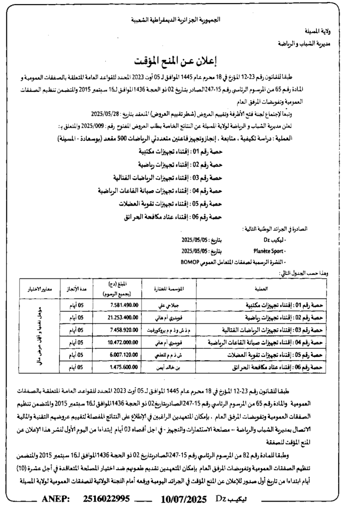 إعلان عن المنح المؤقت انجاز وتجهيز قاعتين متعددتي الرياضات 500 مقعد (بوسعادة-المسيلة)/ مديرية الشباب والرياضة لولاية المسيلة