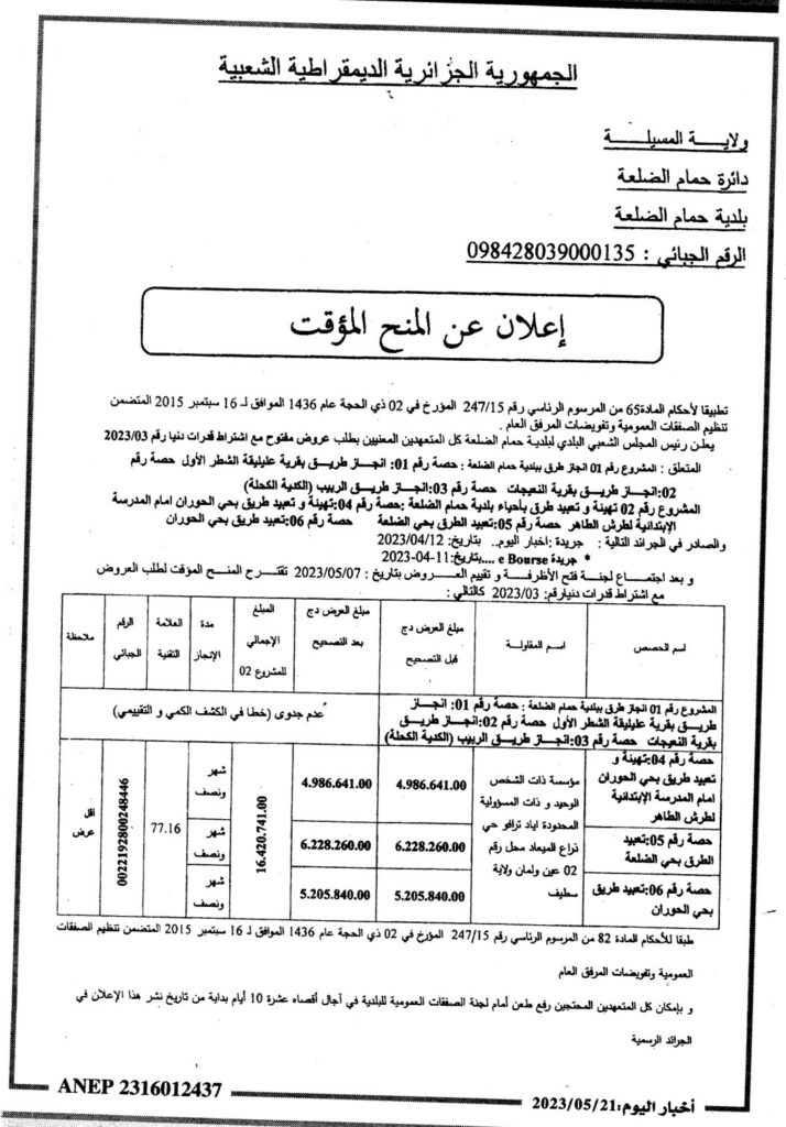 إعلان عن المنح المؤقت: انجاز وتهيئة وتعبيد طرق ببلدية حمام الضلعة