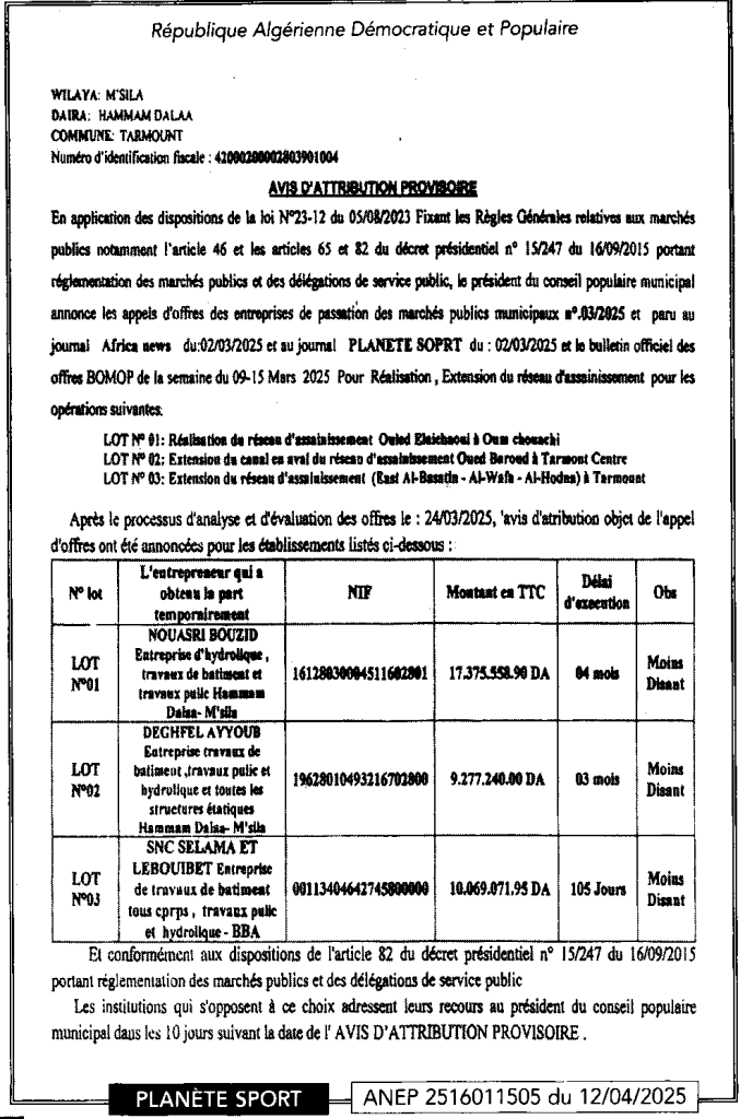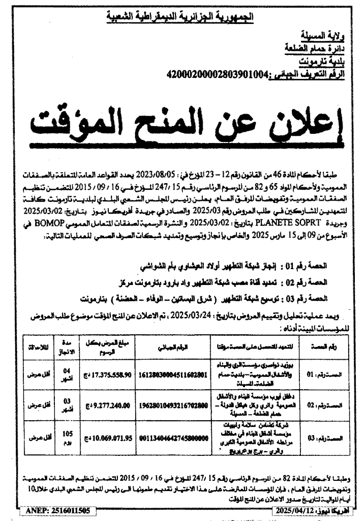 إعلان عن المنح المؤقت انجاز وتوسيع وتمديد شبكات الصرف الصحي/ بلدية تارمونت