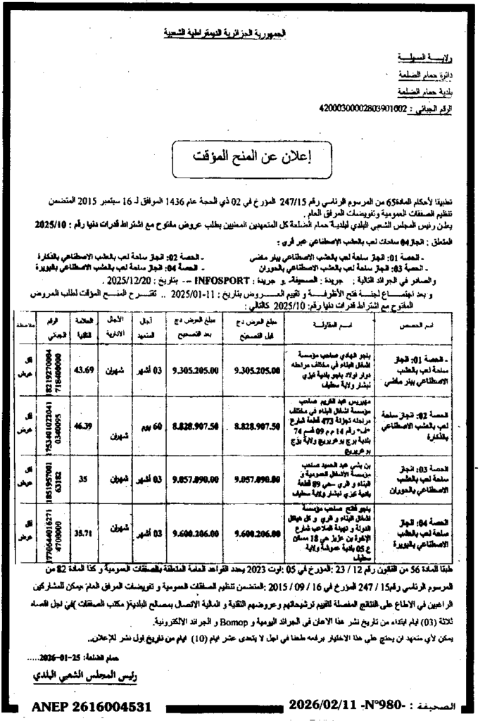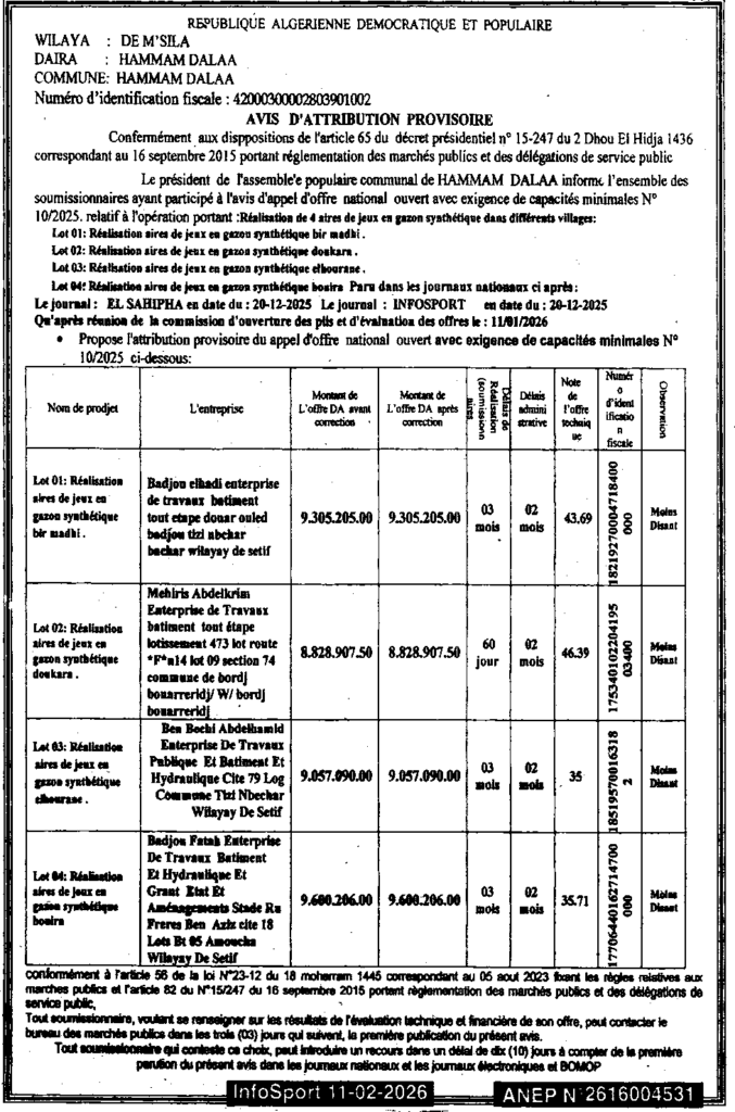 إعلان عن المنح المؤقت انجاز 04 ساحات لعب بالعشب الاصطناعي عبر القرى/ بلدية حمام الضلعة