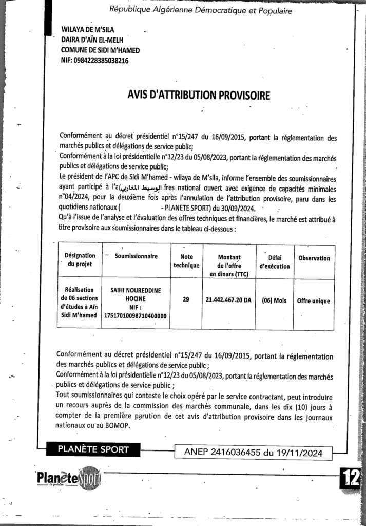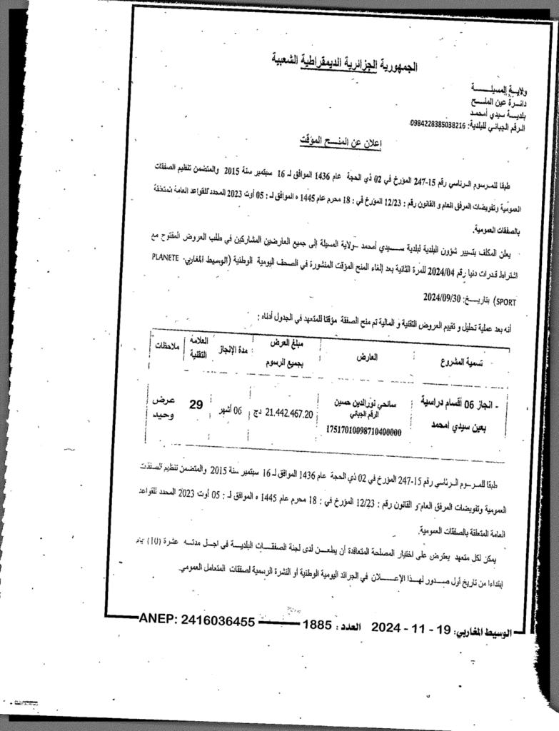إعلان عن المنح المؤقت انجاز 06 أقسام دراسية/ بلدية سيدي امحمد