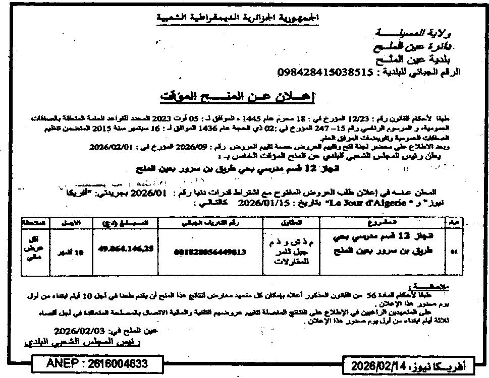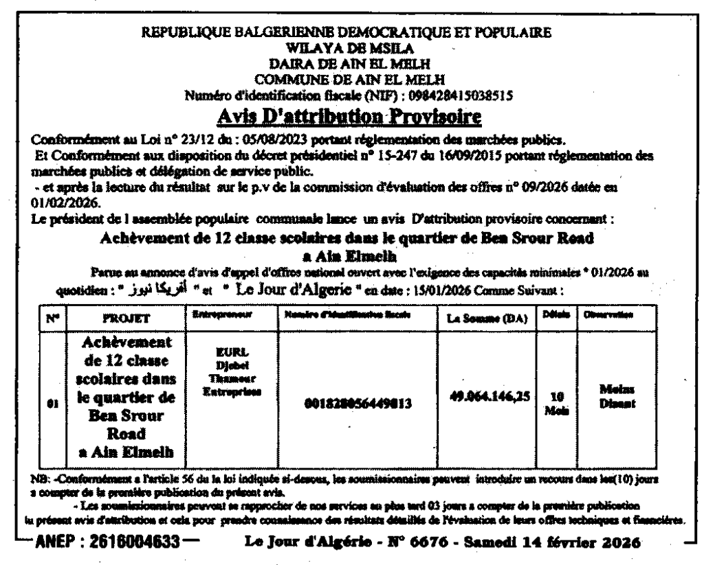 إعلان عن المنح المؤقت انجاز 12 قسم مدرسي بحي طريق بن سرور/ بلدية عين الملح