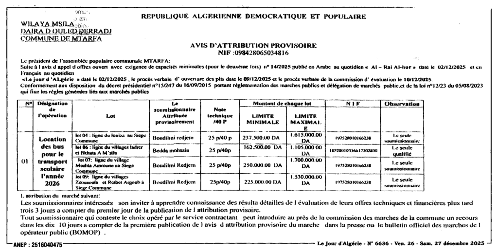 إعلان عن المنح المؤقت ايجارحافلات للنقل المدرسي/ بلدية المطارفة