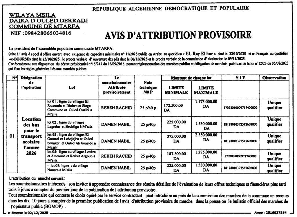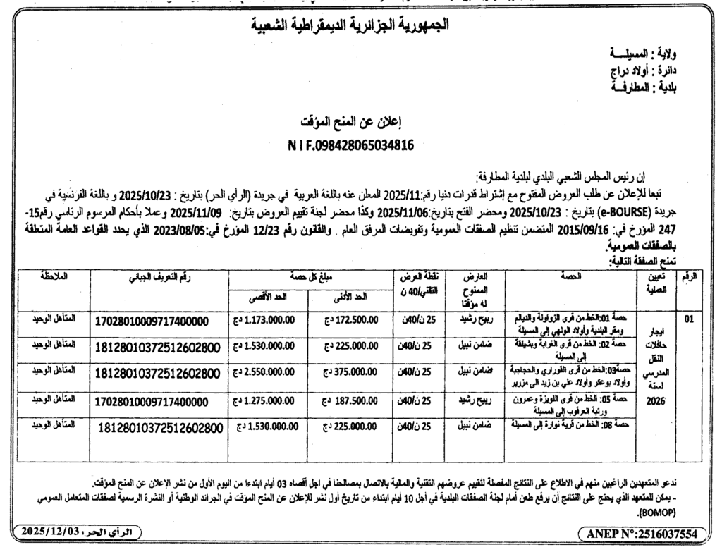 إعلان عن المنح المؤقت ايجار حافلات النقل المدرسي لسنة 2026/ بلدية المطارفة