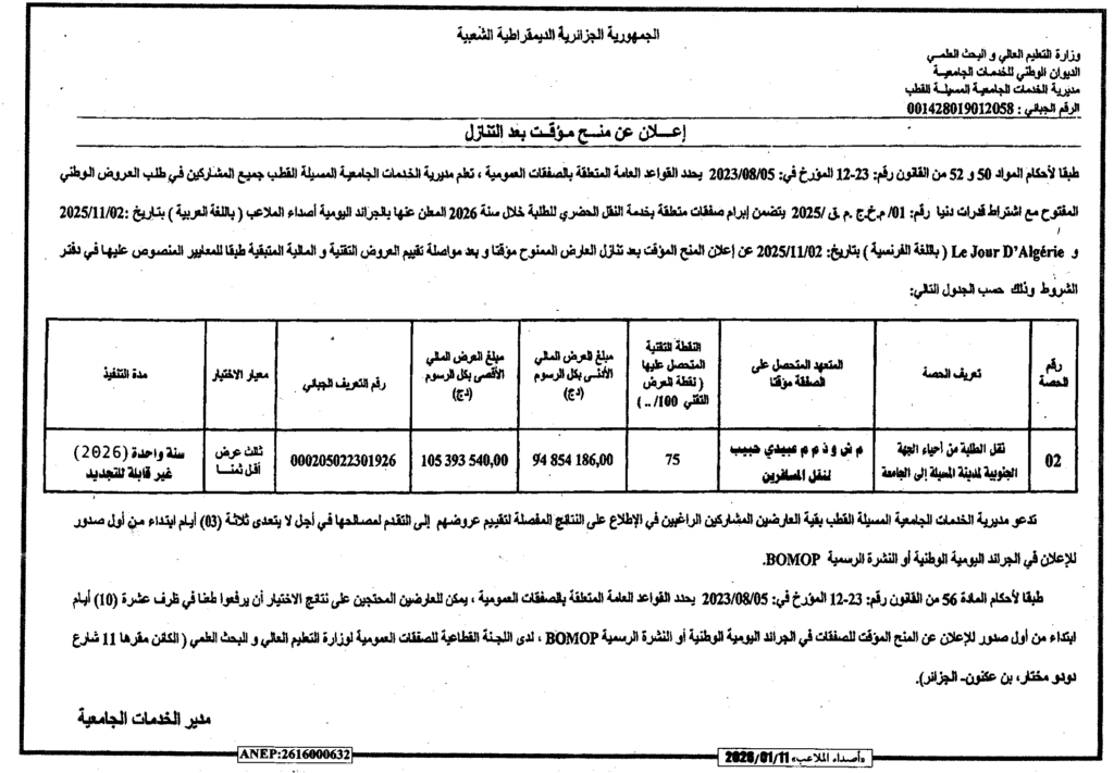 إعلان عن المنح المؤقت بعد التنازل/ مديرية الخدمات الجامعية المسيلة القطب
