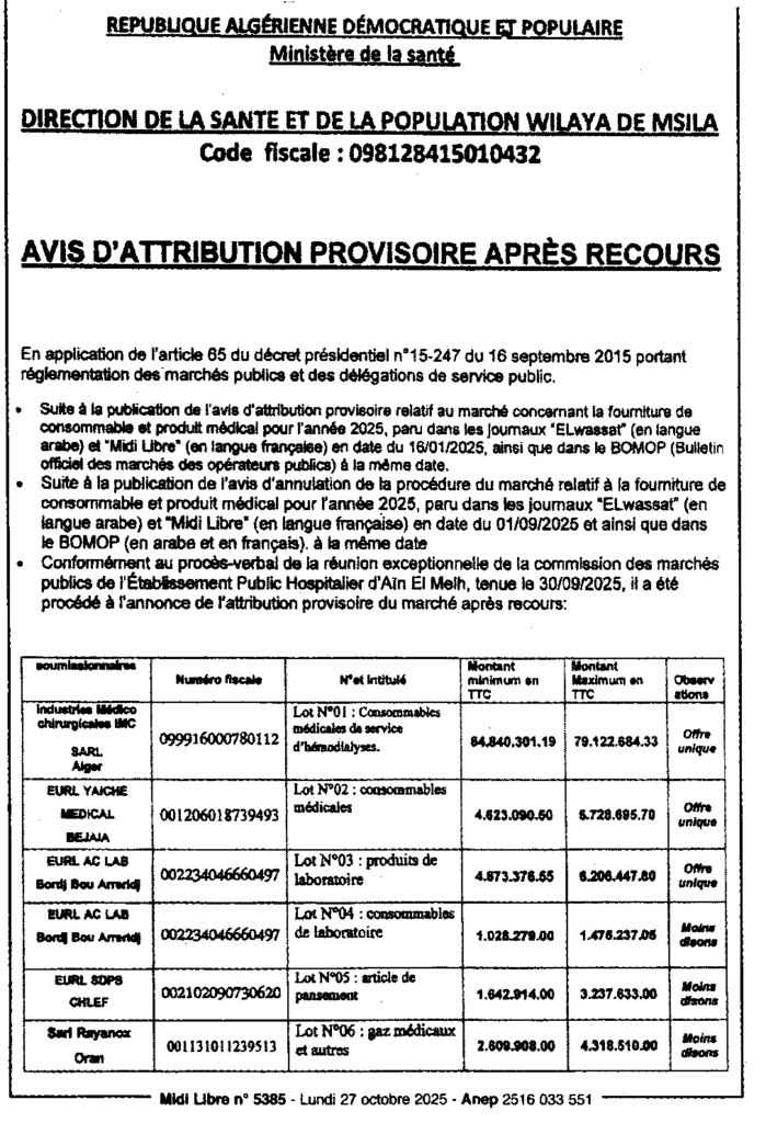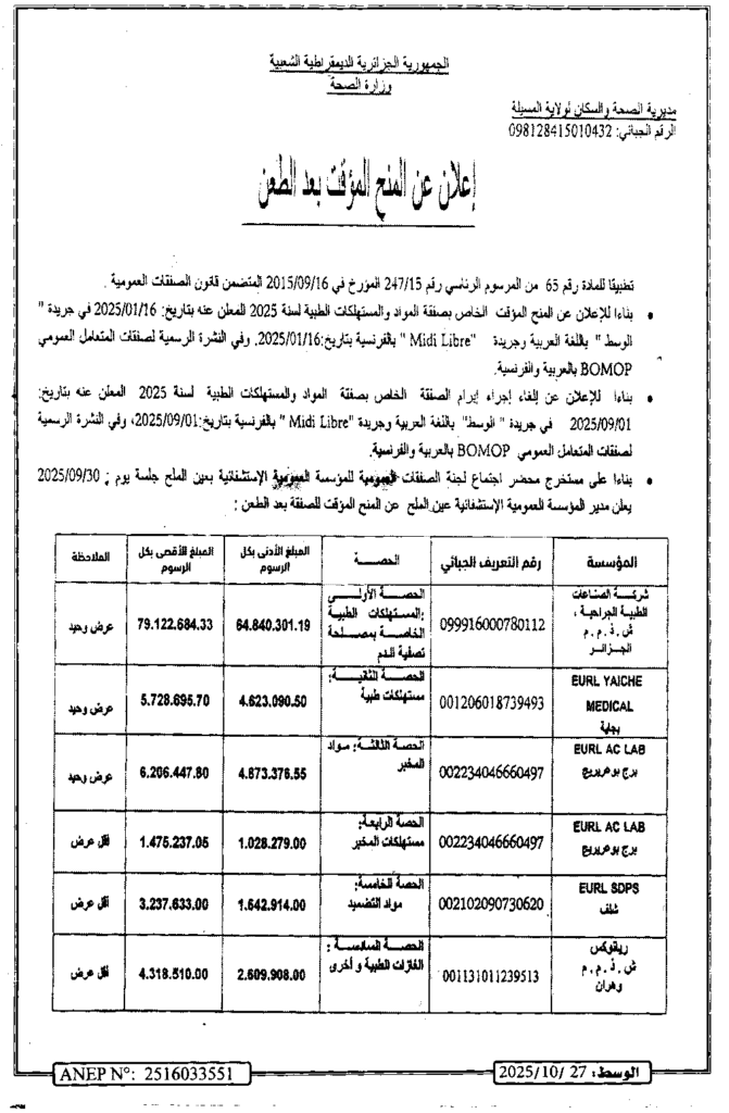 إعلان عن المنح المؤقت بعد الطعن/ مديرية الصحة والسكان لولاية المسيلة