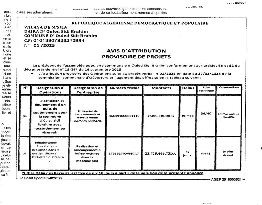إعلان عن المنح المؤقت/ بلدية أولاد سيدي ابراهيم