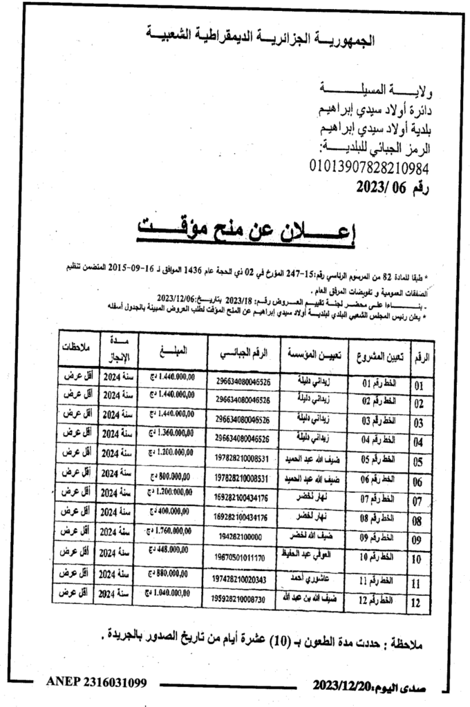 إعلان عن المنح المؤقت/ بلدية أولاد سيدي ابراهيم
