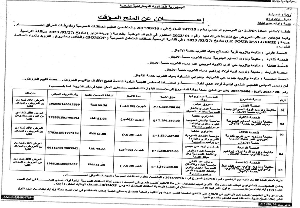 إعلان عن المنح المؤقت/ بلدية أولاد عدي لقبالة