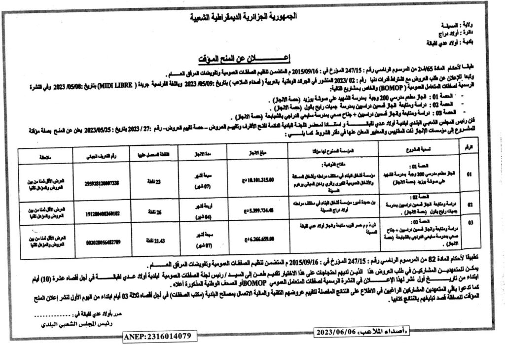 إعلان عن المنح المؤقت/ بلدية أولاد عدي لقبالة