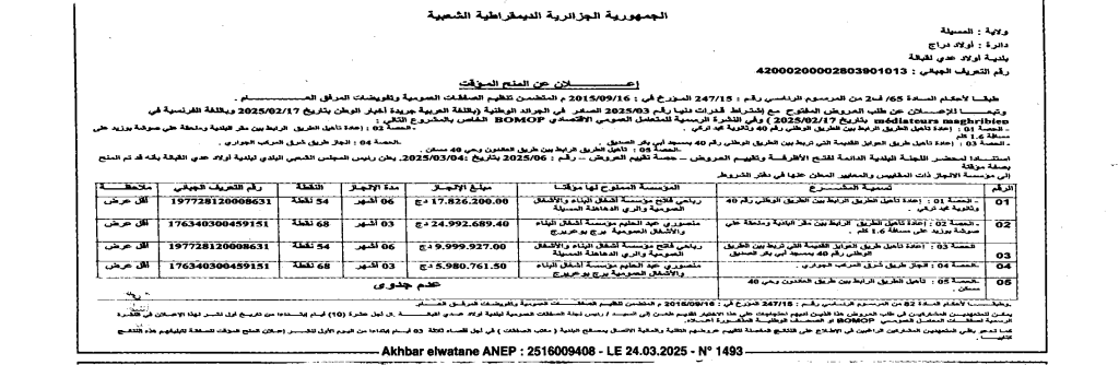 إعلان عن المنح المؤقت / بلدية أولاد عدي لقبالة