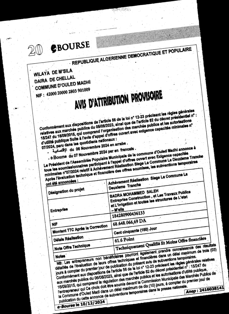 إعلان عن المنح المؤقت/ بلدية أولاد ماضي