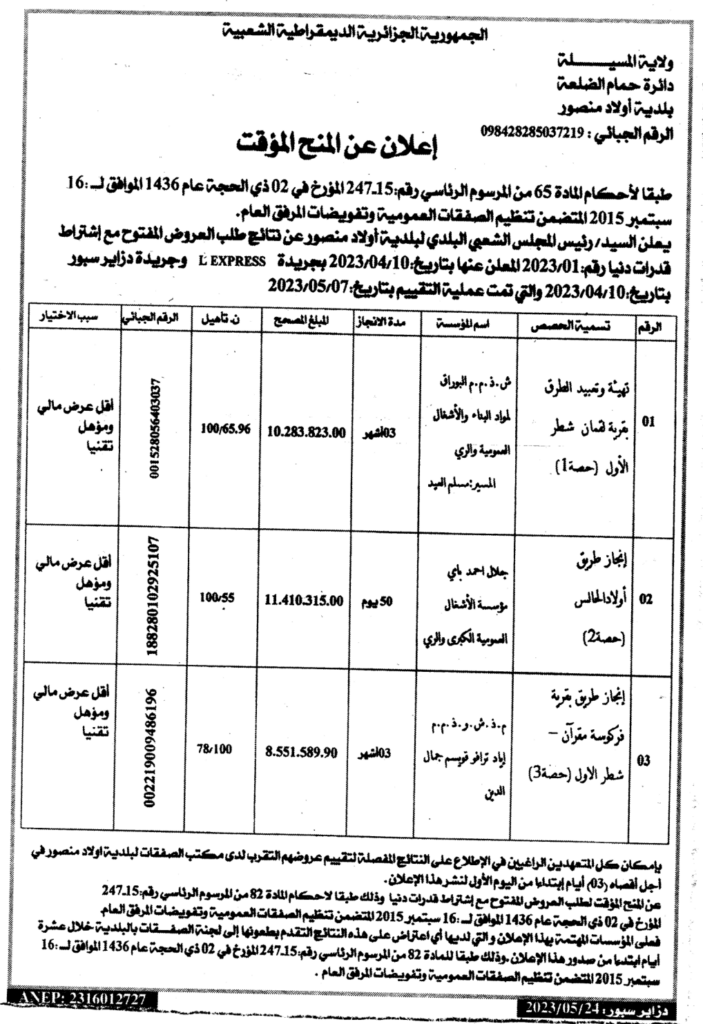 إعلان عن المنح المؤقت/ بلدية أولاد منصور