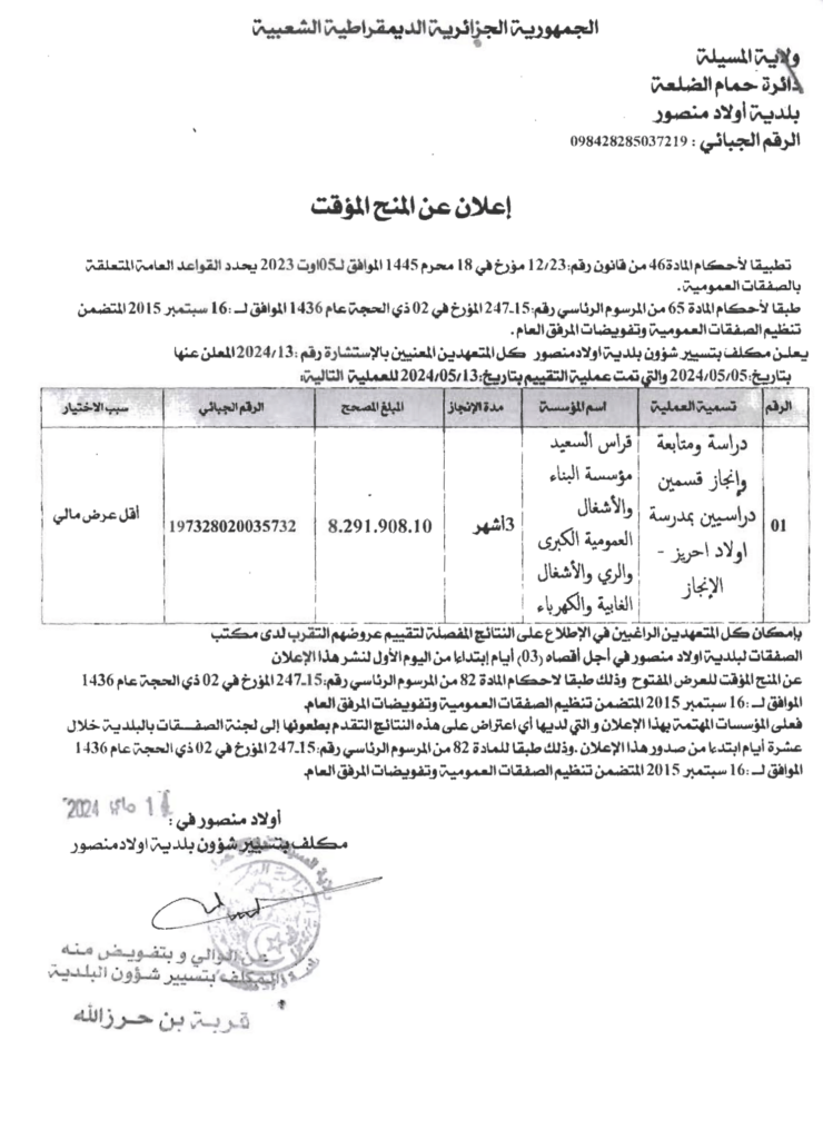 إعلان عن المنح المؤقت بلدية أولاد منصور