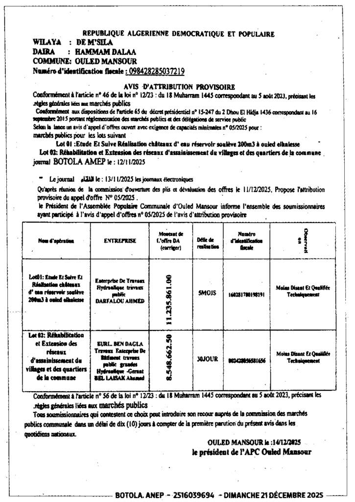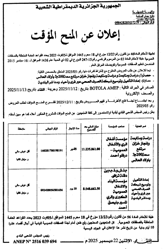 إعلان عن المنح المؤقت دراسة ومتابعة ودراسة وانجاز خزان مرتفع سعة 200 م3/ بلدية أولاد منصور