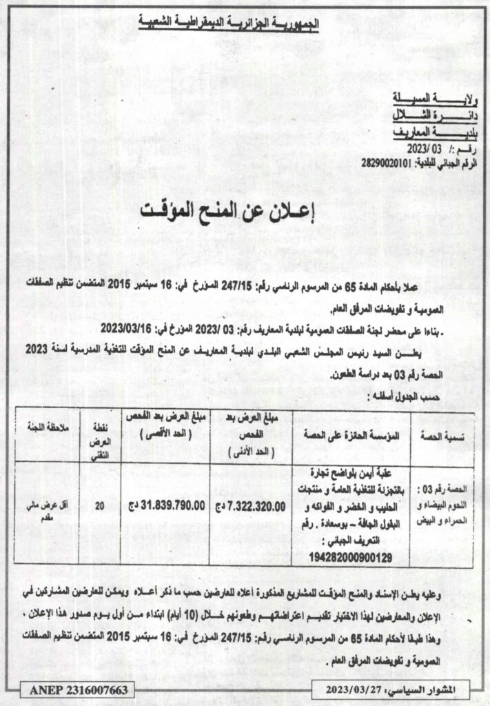إعلان عن المنح المؤقت/ بلدية المعاريف