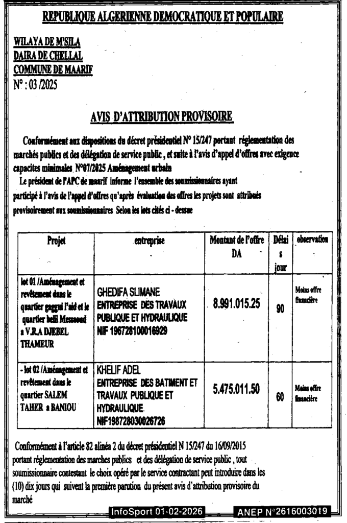 إعلان عن المنح المؤقت/ بلدية المعاريف