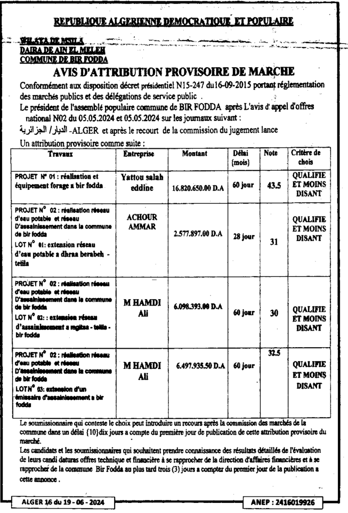 إعلان عن المنح المؤقت بلدية بئر الفضة