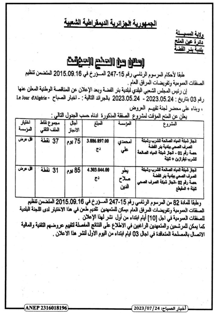 إعلان عن المنح المؤقت/ بلدية بئر الفضة