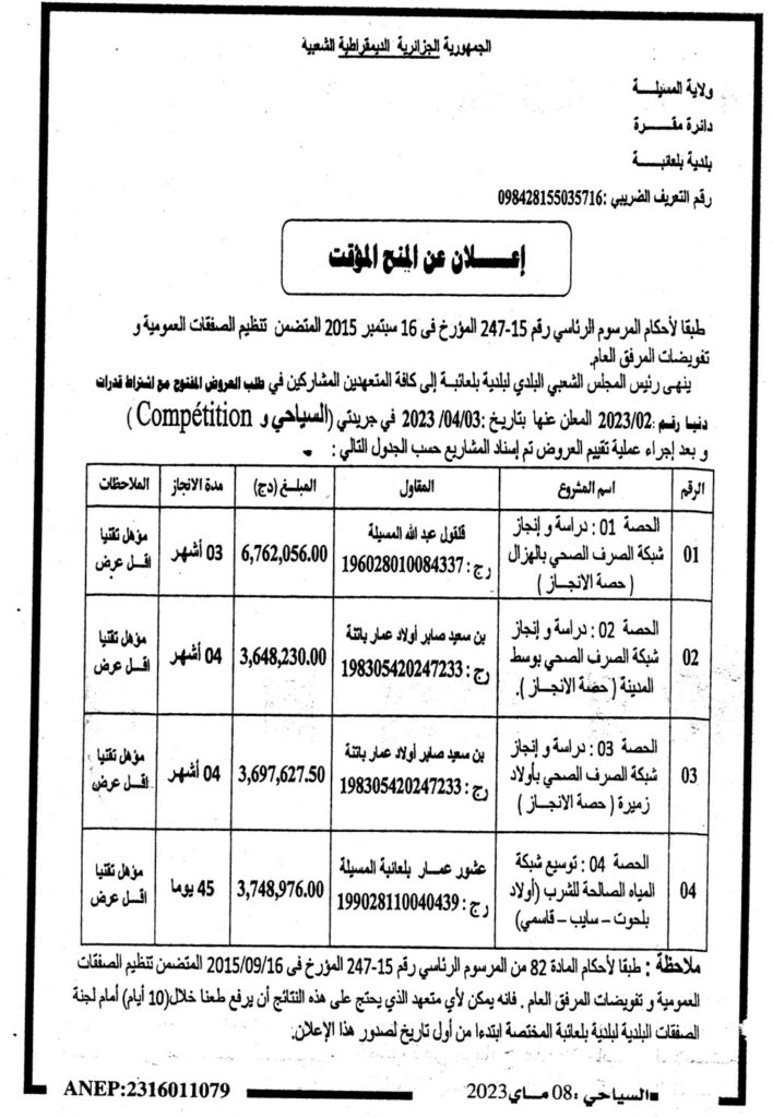 إعلان عن المنح المؤقت بلدية بلعايبة