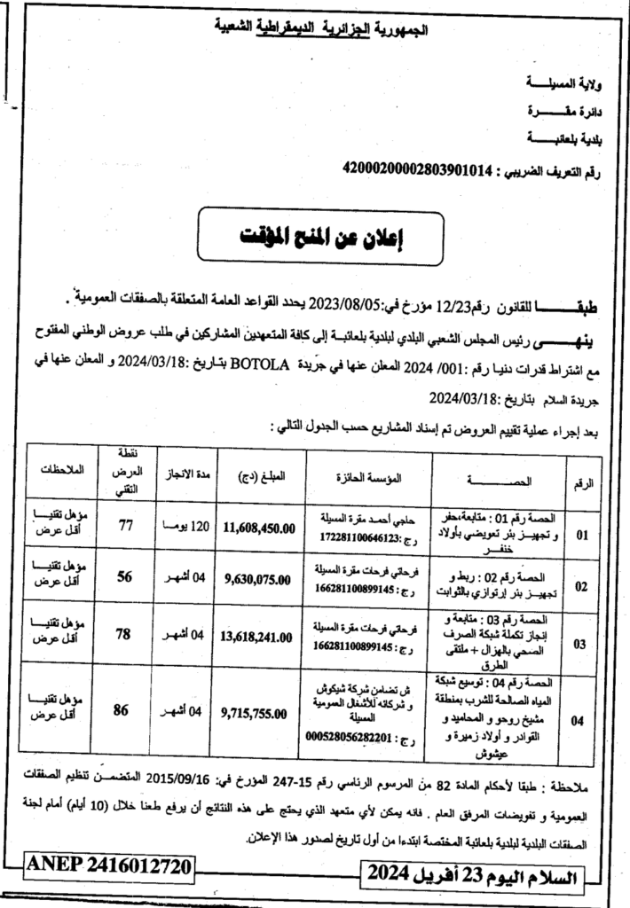 إعلان عن المنح المؤقت/ بلدية بلعايبة