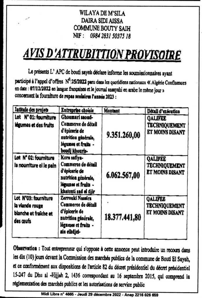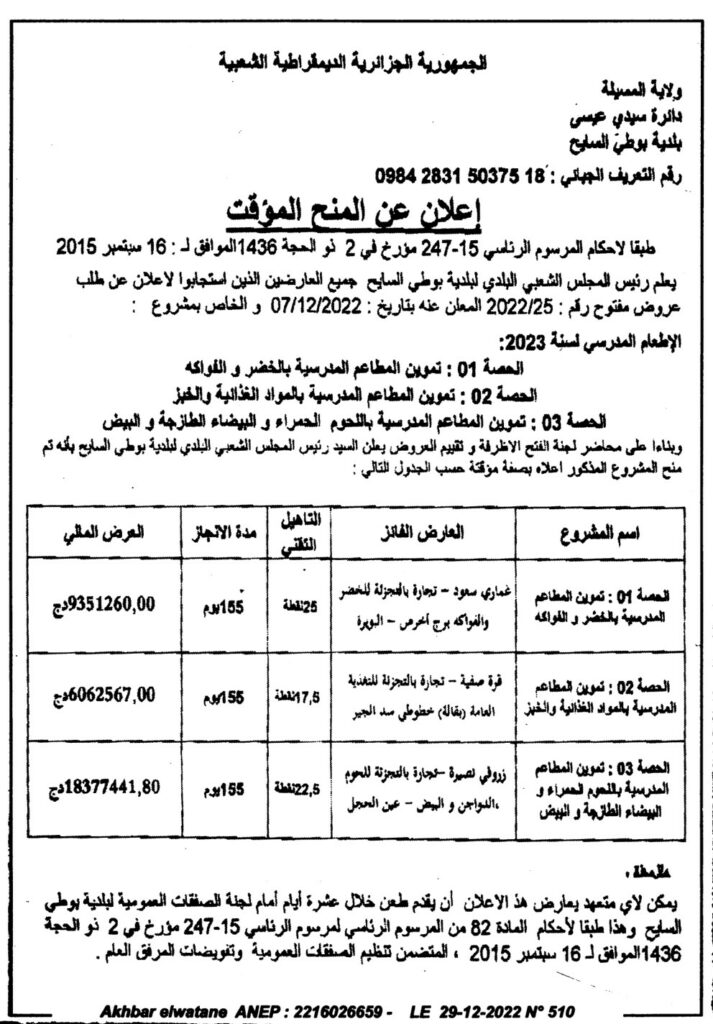 مشروع : الإطعام المدرسي لسنة 2023الحصة 01: تموين المطاعم المدرسية بالخضر و الفواكهالحصة 02: تموين المطاعم المدرسية بالمواد الغذائية والخبزالحصة 03: تموين المطاعم المدرسية باللحوم الحمراء والبيضاء الطازجة والبيض29 ديسمبر، 20220 32 شاركها فيسبوك X مشاركة عبر البريد طباعة