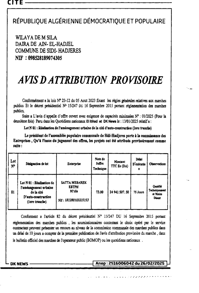 إعلان عن المنح المؤقت إنجاز التهيئة الحضرية لحي البناء الذاتي/ بلدية سيدي هجرس