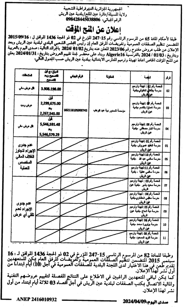 إعلان عن المنح المؤقت: إعادة تهيئة وترميم المدارس الابتدائية ببلدية عين الريش