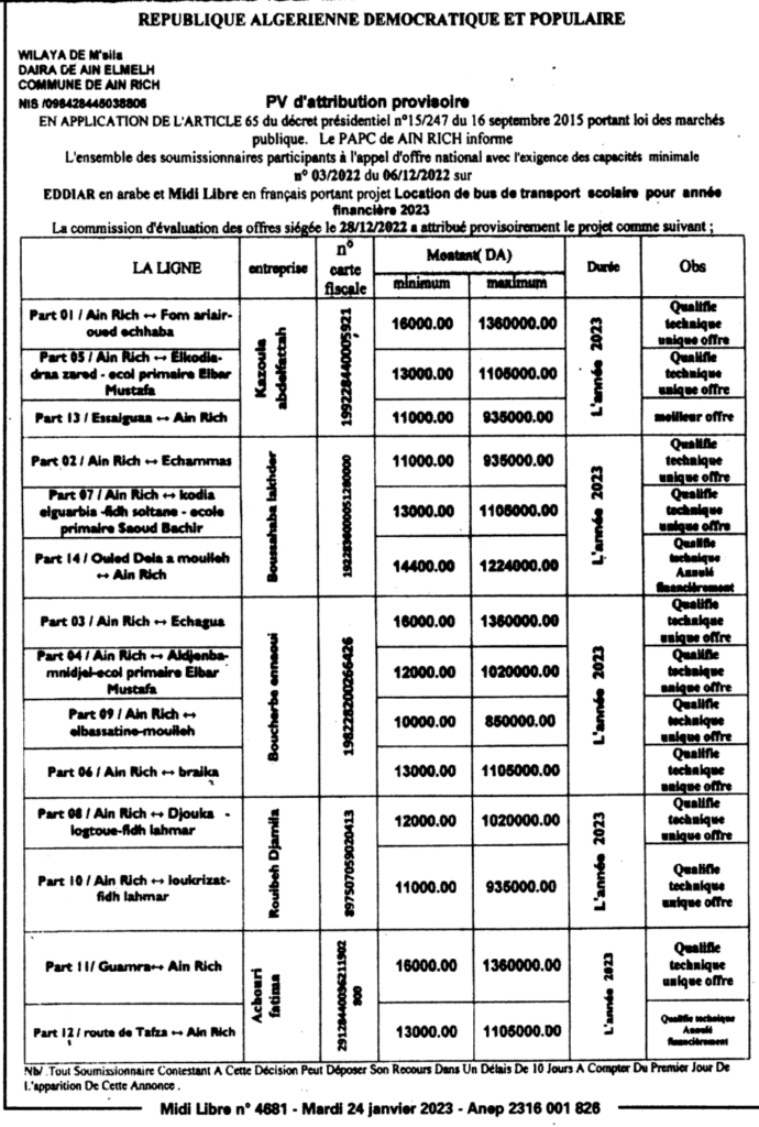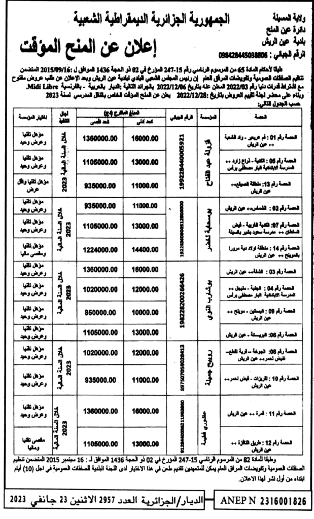 إعلان عن المنح المؤقت/ بلدية عين الريش
