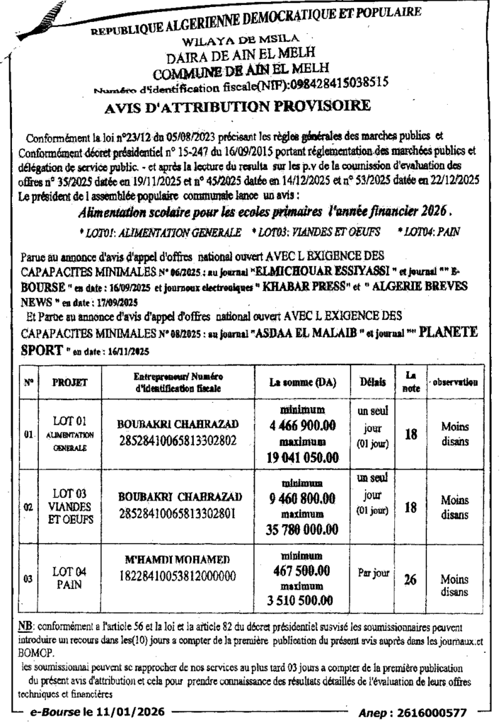 إعلان عن المنح المؤقت/ بلدية عين الملح
